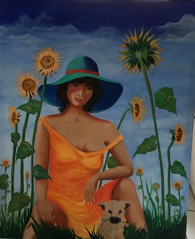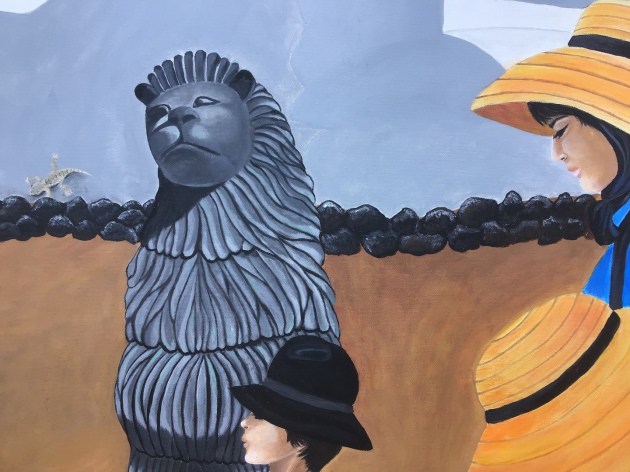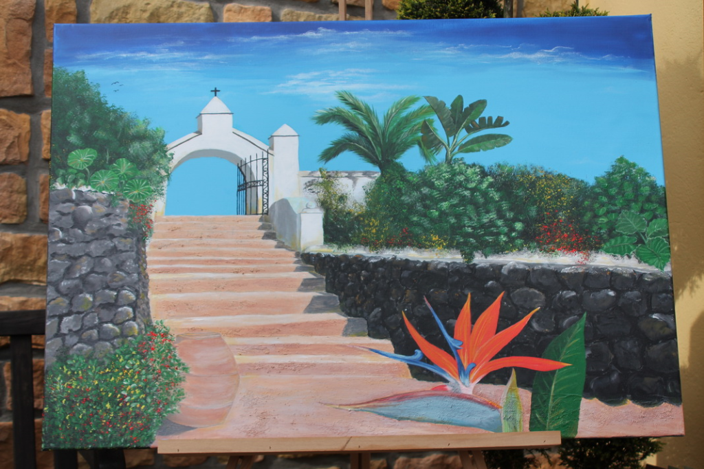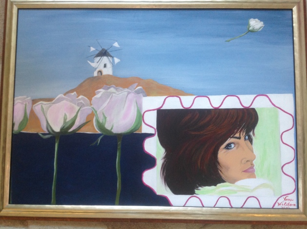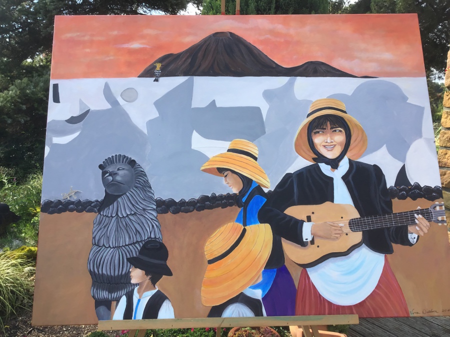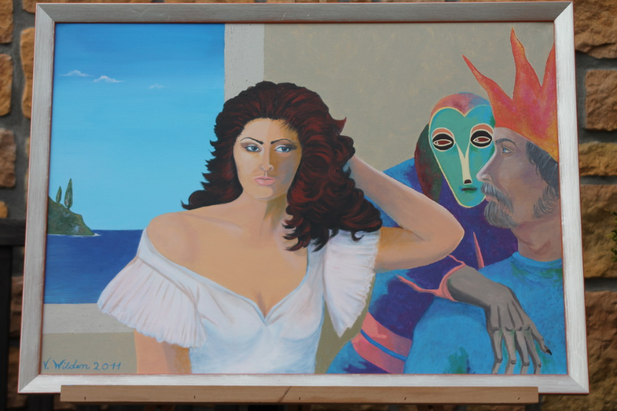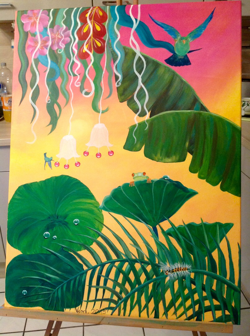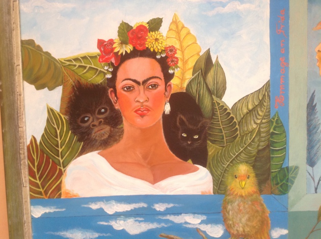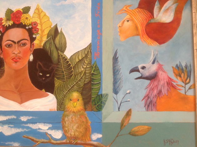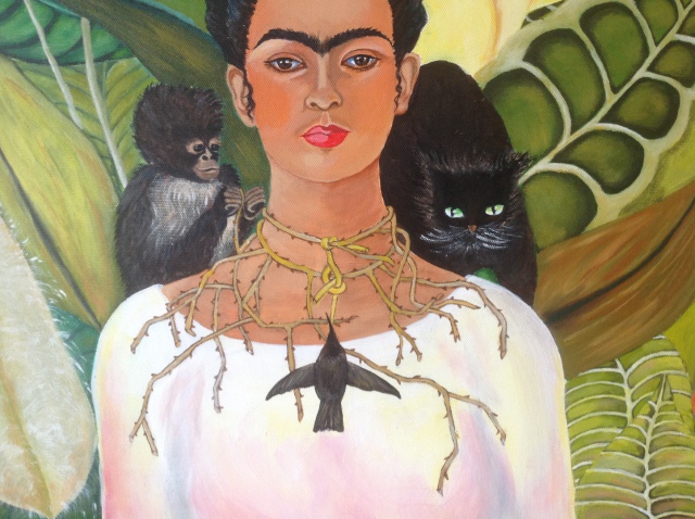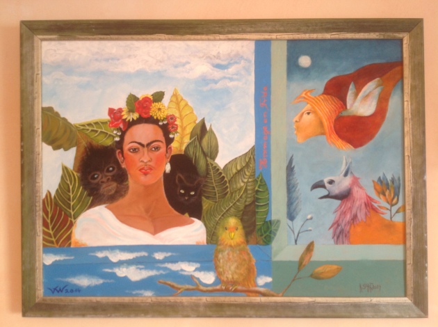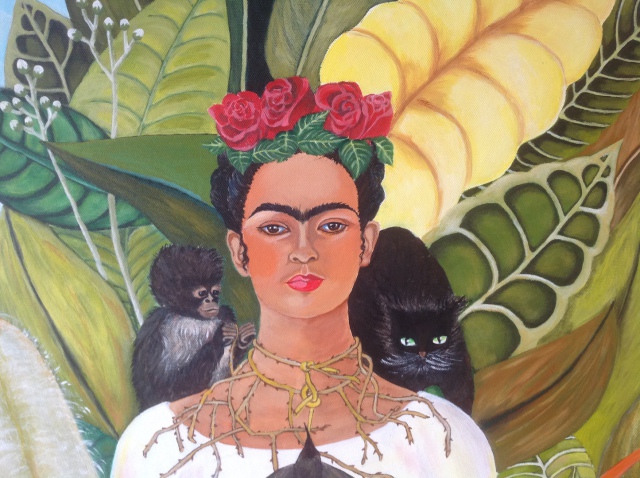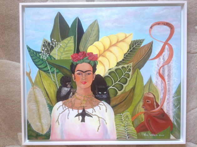 Auftragsarbeit ,verkauft , Hommage an Frida, ...alles in ihren Bildern hat Symbolwert, der Blätterwald, die Katze ,das Äffchen,das Greisenhaupt, und die prähistorische Tonfigur rechts im Bild...