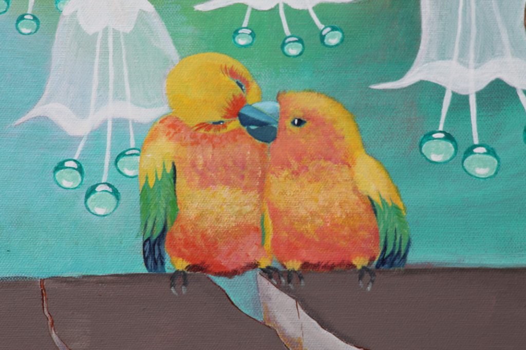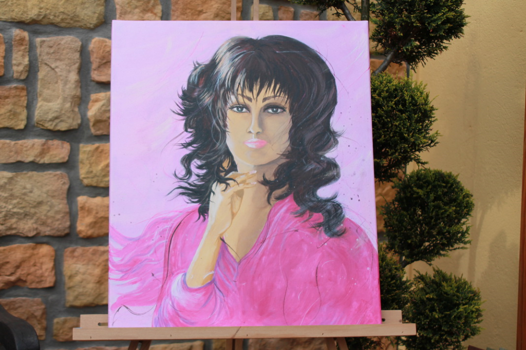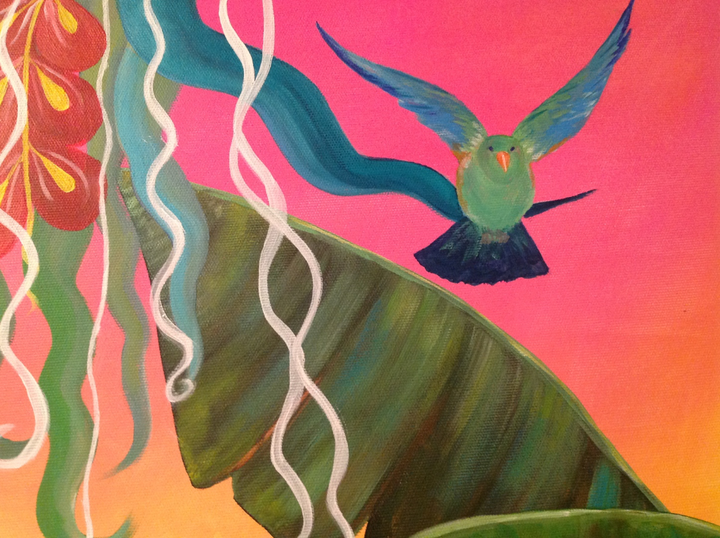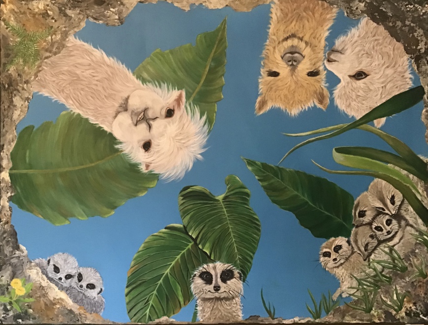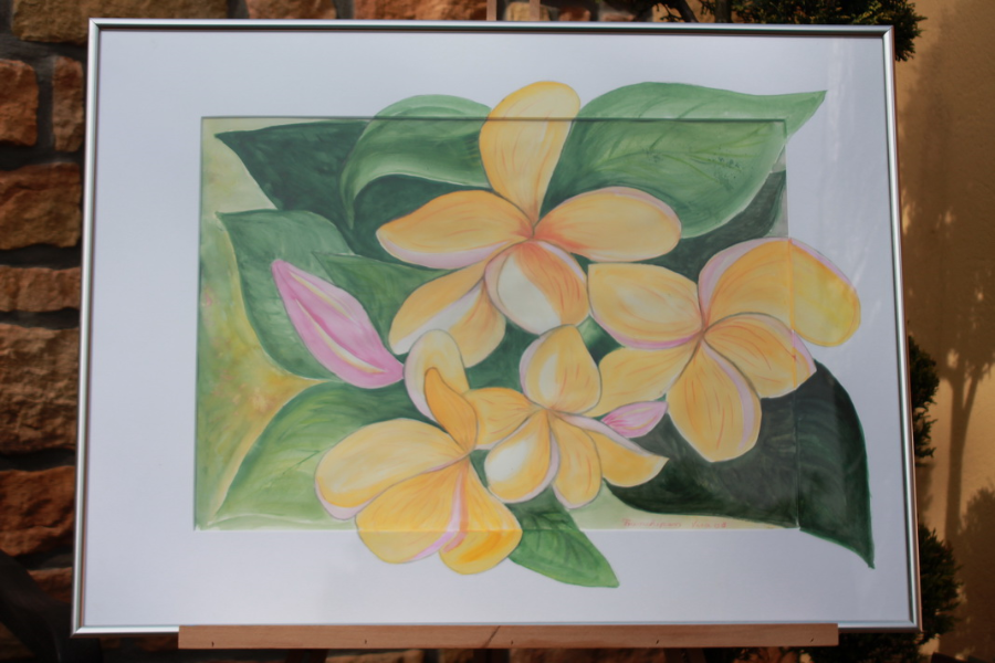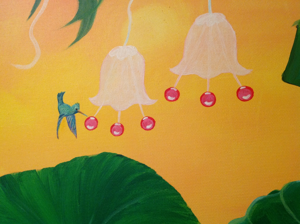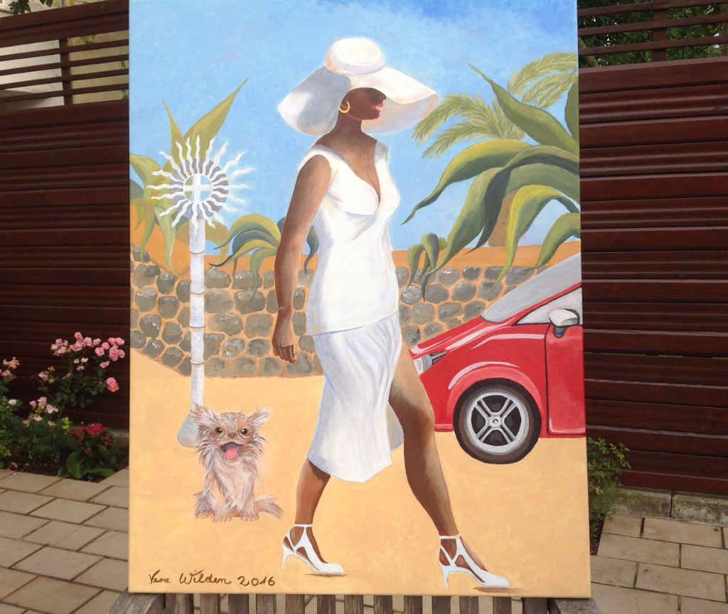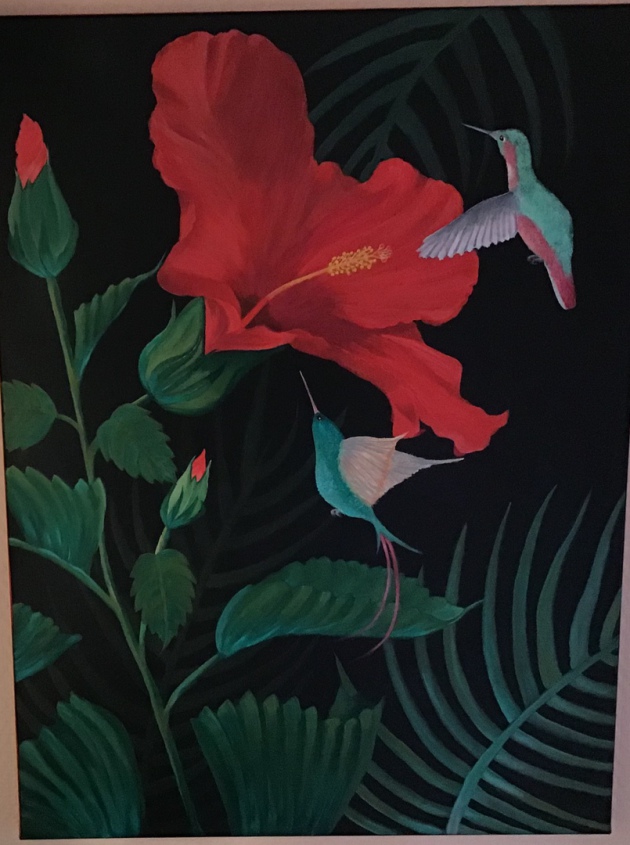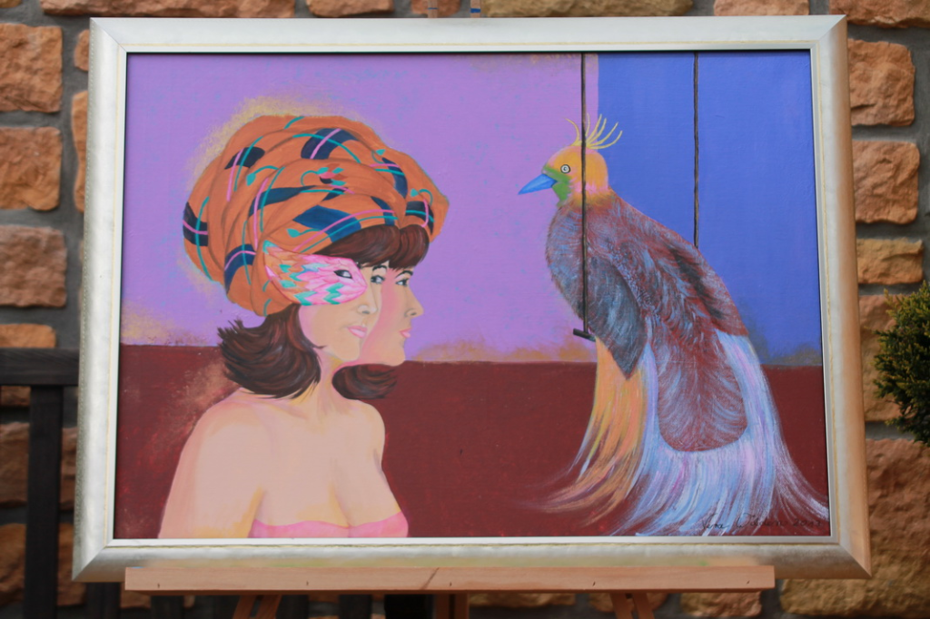 Auftragsarbeit ,verkauft , Hommage an Frida, ...alles in ihren Bildern hat Symbolwert, der Blätterwald, die Katze ,das Äffchen,das Greisenhaupt, und die prähistorische Tonfigur rechts im Bild...