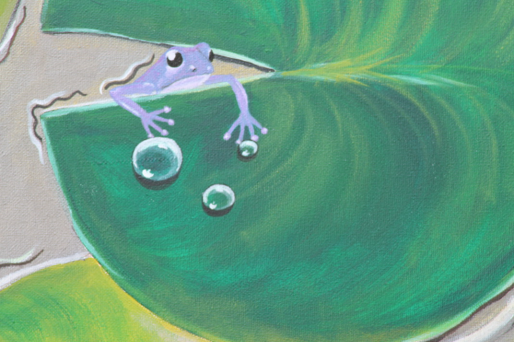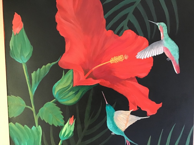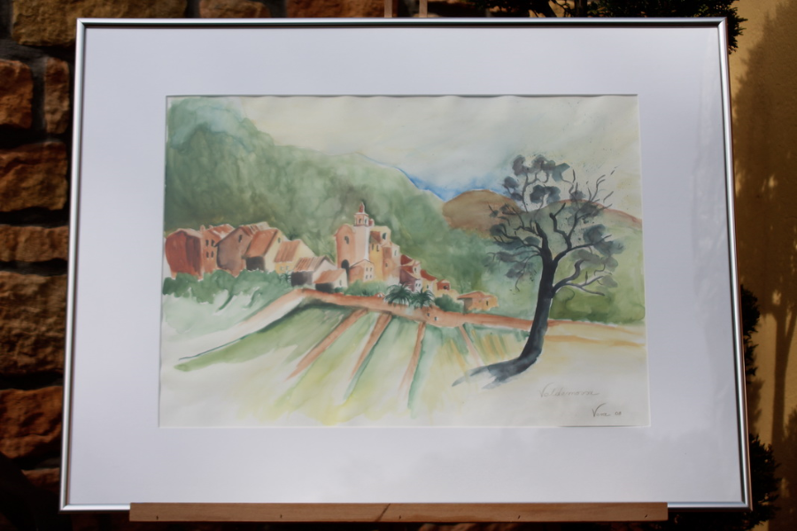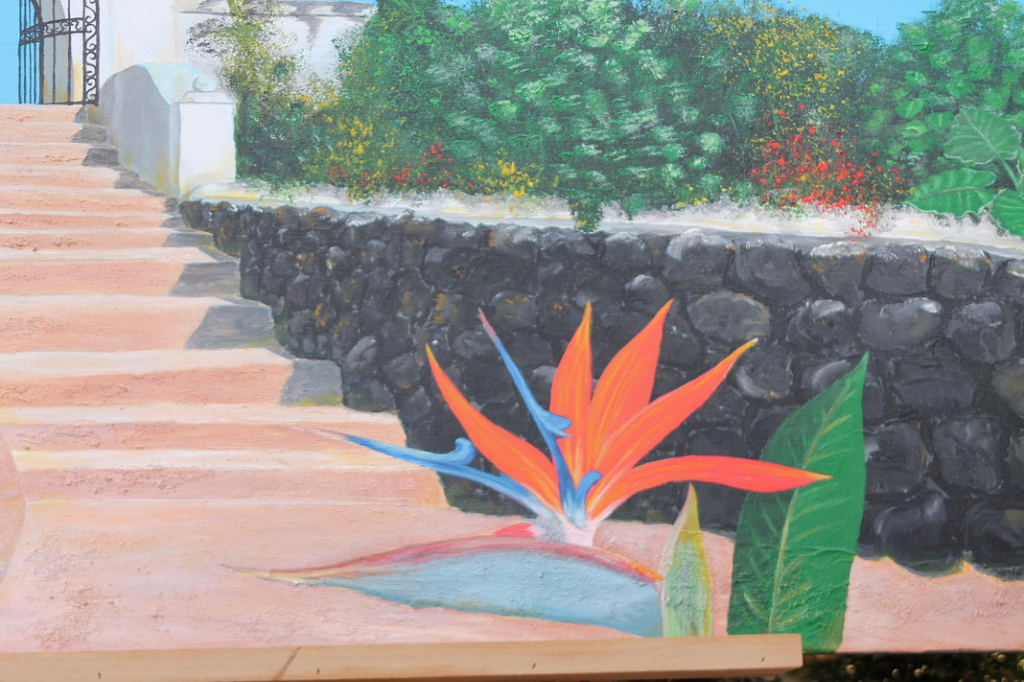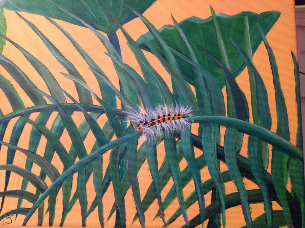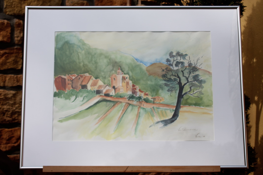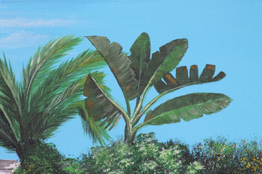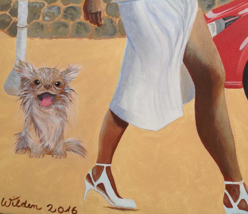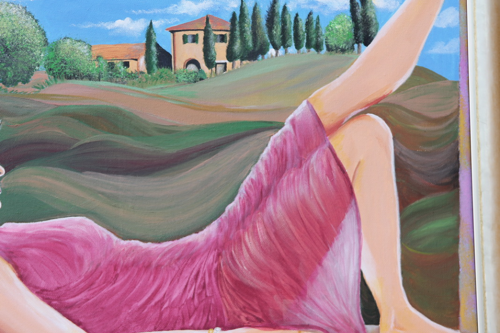 Auftragsarbeit ,verkauft , Hommage an Frida, ...alles in ihren Bildern hat Symbolwert, der Blätterwald, die Katze ,das Äffchen,das Greisenhaupt, und die prähistorische Tonfigur rechts im Bild...